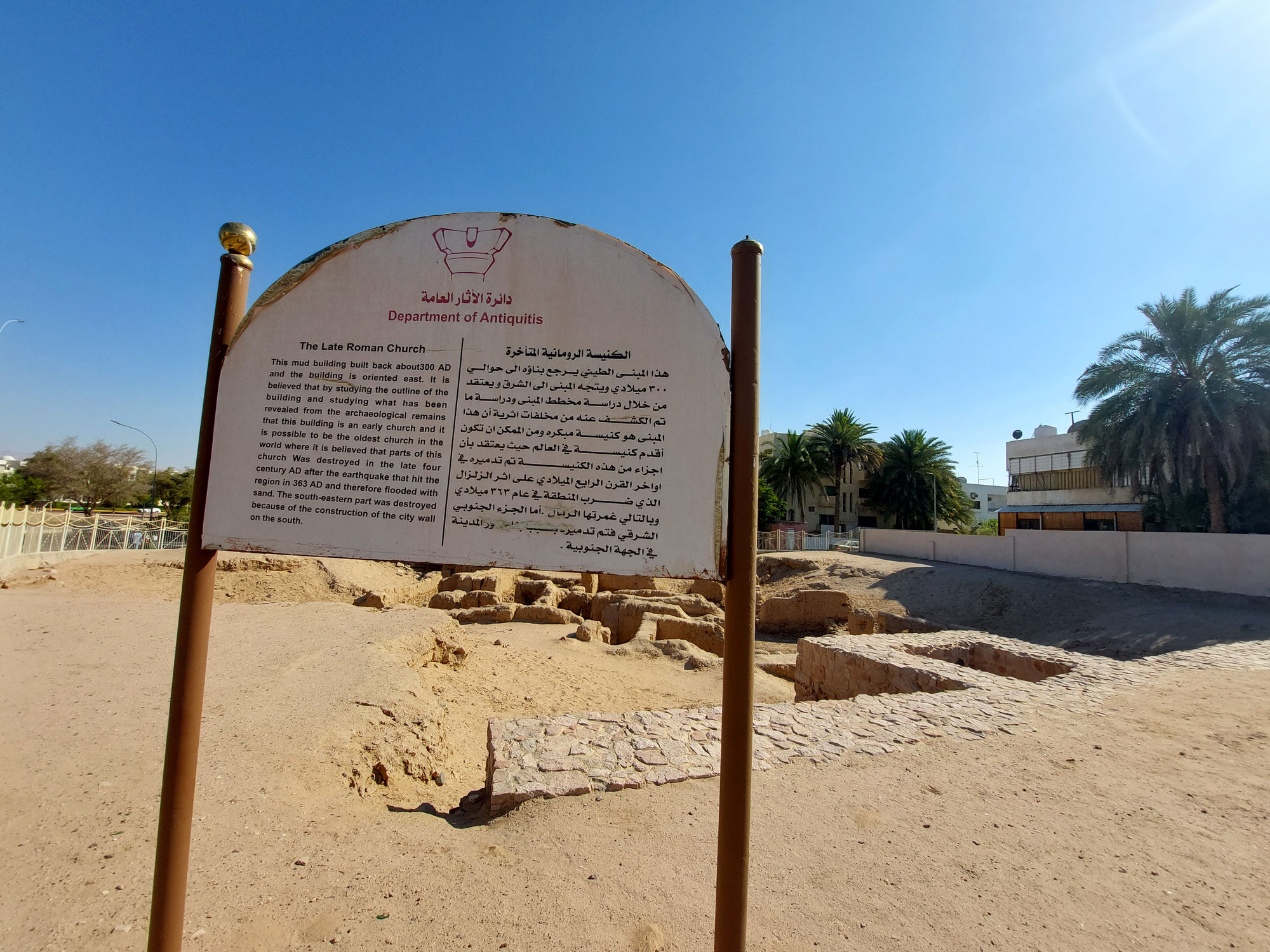 Discovered in 1998, it was built between the end of the III and the beginning of the IV century AD: this makes it slightly older than the Church of the Holy Sepulcher in Jerusalem A stone's throw from the JETT Bus station are the ruins of an ancient Byzantine church, evidence of an important historical phase of the city. The church was built not far from the coast. The Byzantines gave the city of Ayla, (ancient Aqaba) special attention because of its commercial importance. The presence of the Bishop of Ayla at the Council of Nicaea (325) testifies that the city was an episcopal centre and confirms its importance.